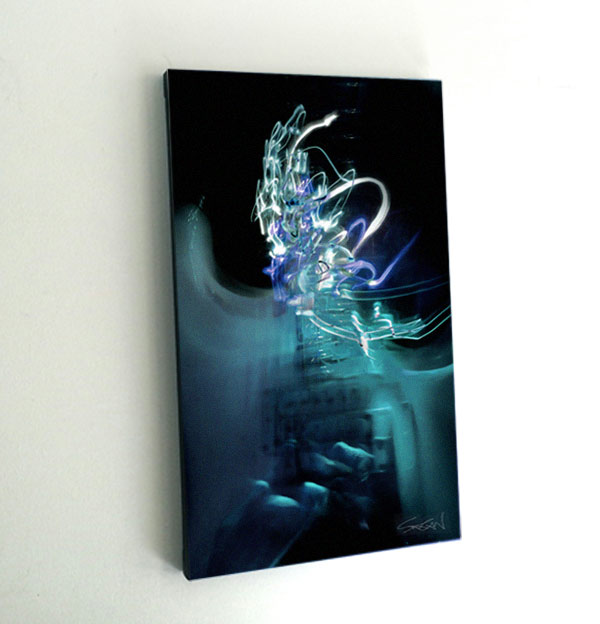 The Right Hand of Doom is one of the most vibrant and vivid works in the collection. The guitar work is different than that of the other pieces in that it is captured from the bridge of the guitar. Viewers will note Ian's hands at the bottom of the canvas, captured in the process of creation.